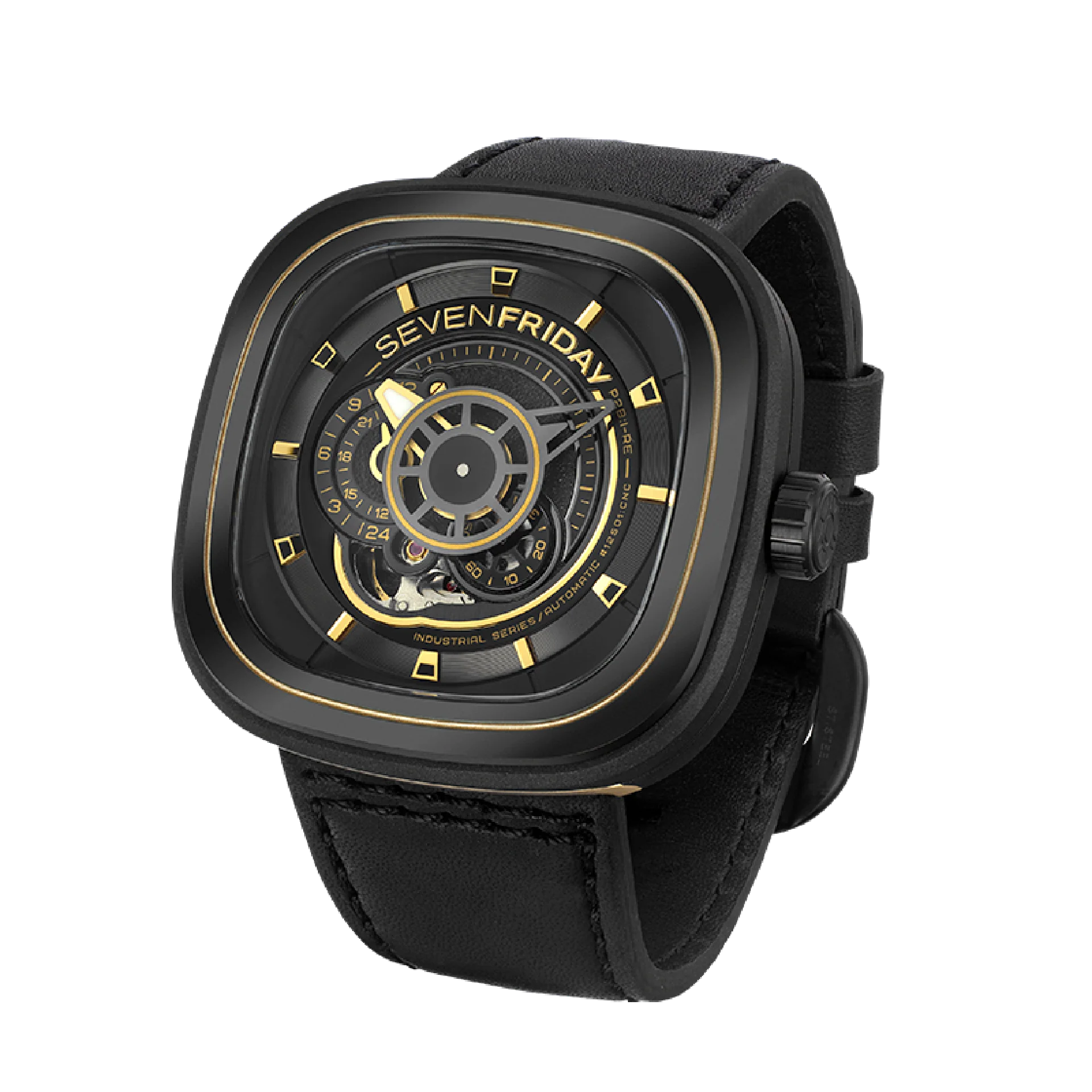 The SevenFriday P2B/02 fuses industrial aesthetics with bold design. Featuring a gunmetal PVD stainless steel case with gold accents, this watch exudes a rugged yet refined look. The open balance wheel dial showcases the automatic Miyota 82S7 movement, offering a 40-hour power reserve. A black calfskin leather strap, hardened anti-reflective mineral glass, and 3 ATM water resistance complete this statement timepiece.
